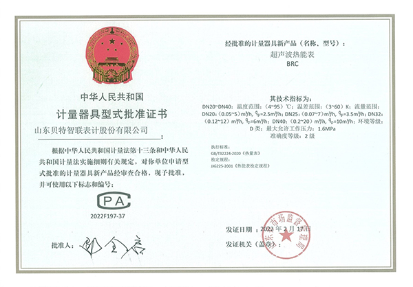 計(jì)量器具型式批準(zhǔn)證書(shū)-小口徑超聲波熱能表