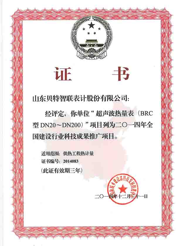 超聲波熱量表住建部推廣證書