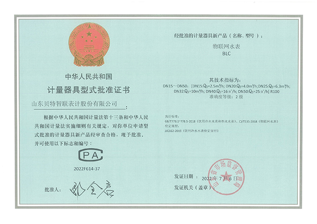 計(jì)量器具型式批準(zhǔn)證書(shū)—物聯(lián)網(wǎng)水表
