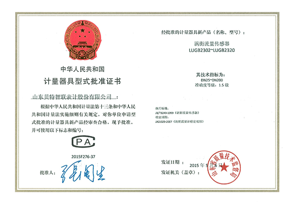 計(jì)量器具型式批準(zhǔn)證書(shū)—渦街流量傳感器